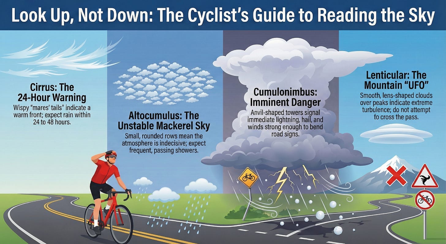 I once watched altocumulus thicken all morning on the road to a mountain pass in the Pyrenees. Mackerel sky. I knew the rhyme. I knew the theory. And I kept riding, because the patches of blue between the scales looked generous enough, and the pass was only two hours away, and I’d already eaten my last energy bar, so stopping meant sitting hungry under a tree with nothing to do but think about how far back the last village was. The sky wasn’t indecisive. I was.